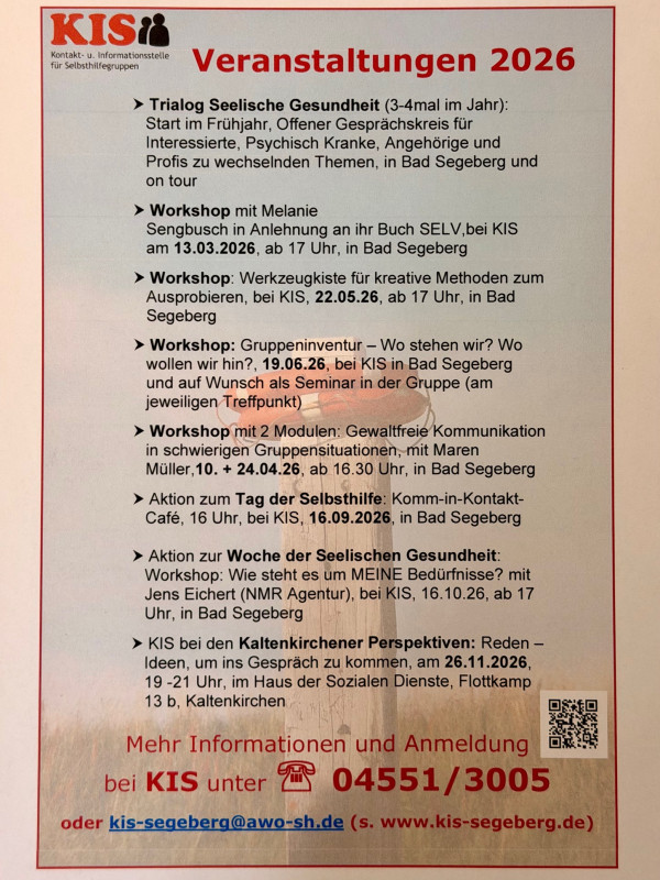 Immer zum Jahreswechsel wird der Selbsthilfewegweiser für den Kreis Segeberg von KIS neu aufgelegt. Das schaffen wir nur mit Hilfe der Aktiven aus der Selbsthilfe. Wenn es Änderungen bei den Kontakdaten, den Treffpunkt betreffend oder andere neue Informationen gibt, nehmen wir sie gern jederzeit in der Homepage auf. Die Gruppenliste ist jederzeit auf der Homepage und in der neuen Selbsthilfe-App von KIS Segeberg einzusehen. Bitte meldet Änderungen für eure Gruppen bei KIS, damit wir immer die richtigen Kontaktdaten und Informationen weiter geben können. Am besten per Mail unter kis-segeberg@awo-sh.de oder telefonisch unter 04551/3005.